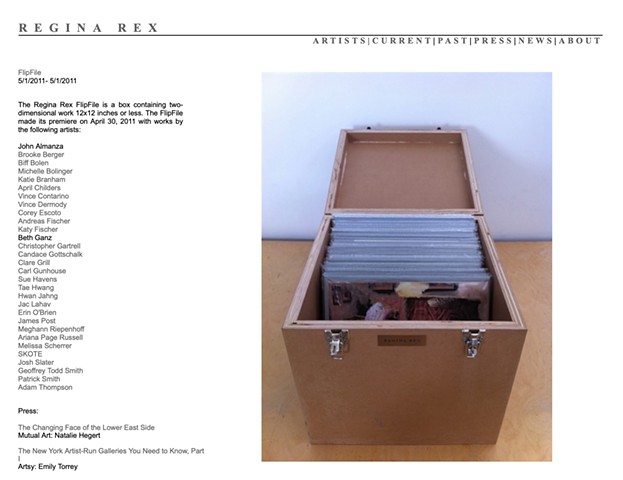 April 2011: The Regina Rex FlipFile features two-dimensional work 12×12 inches or less. This ongoing project begins with works by John Almanza, Brooke Berger, Biff Bolen, Michelle Bolinger, April Childers, Vince Contarino, Vince Dermody, Corey Escoto, Andreas Fischer, Katy Fischer, Beth Ganz, Christopher Gartrell, Candace Gottschalk, Clare Grill, Carl Gunhouse, Sue Havens, Tae Hwang, Hwan Jahng, Jac Lahav, Erin O’Brien, James Post, Meghann Riepenhoff, Ariana Page Russell, Melissa Scherrer, SKOTE, Josh Slater, Geoffrey Todd Smith, Patrick Smith and Adam Thompson.